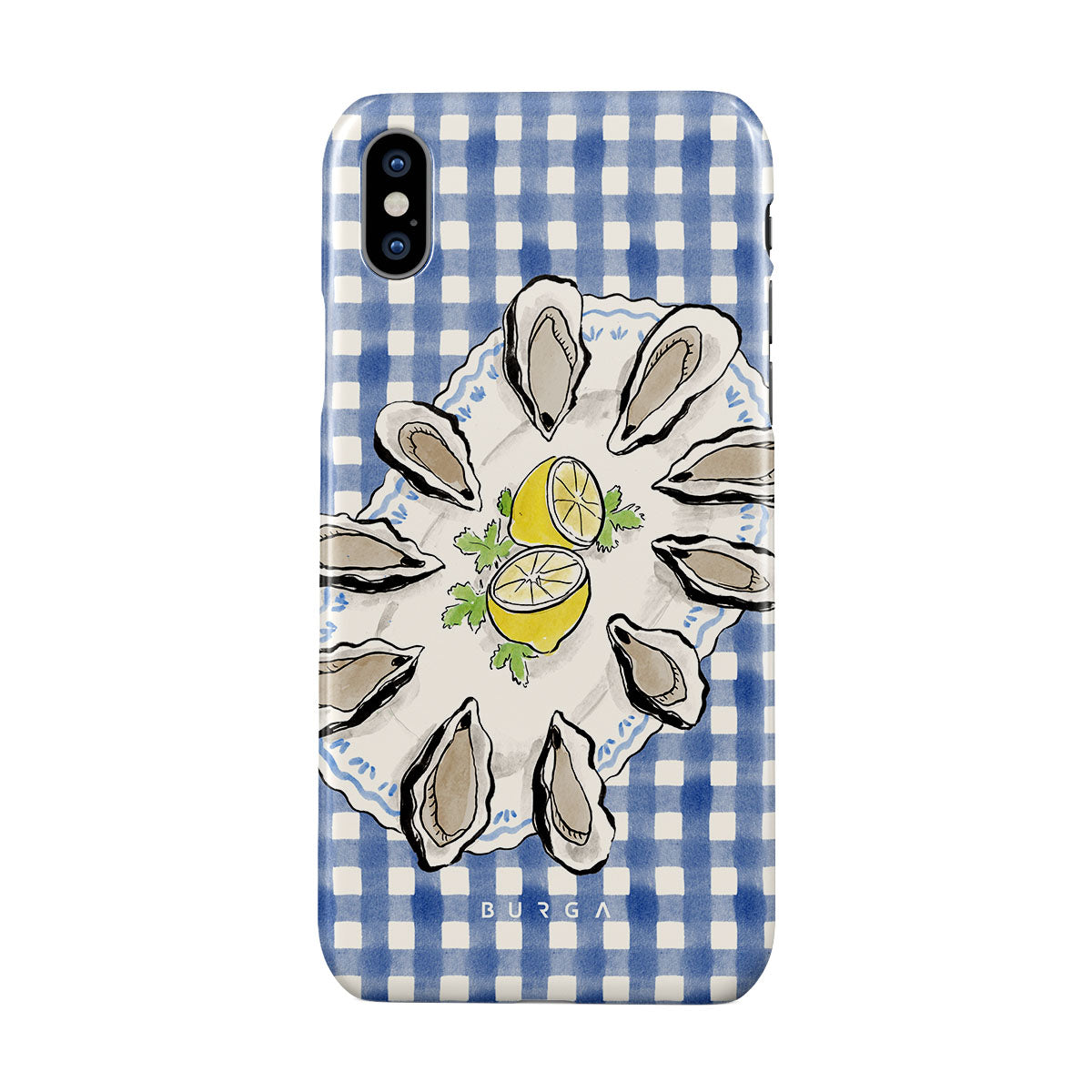 Este design contém:Ostras, limão, padrão xadrez azul, elementos costeiros frescos, tons suaves pastel.