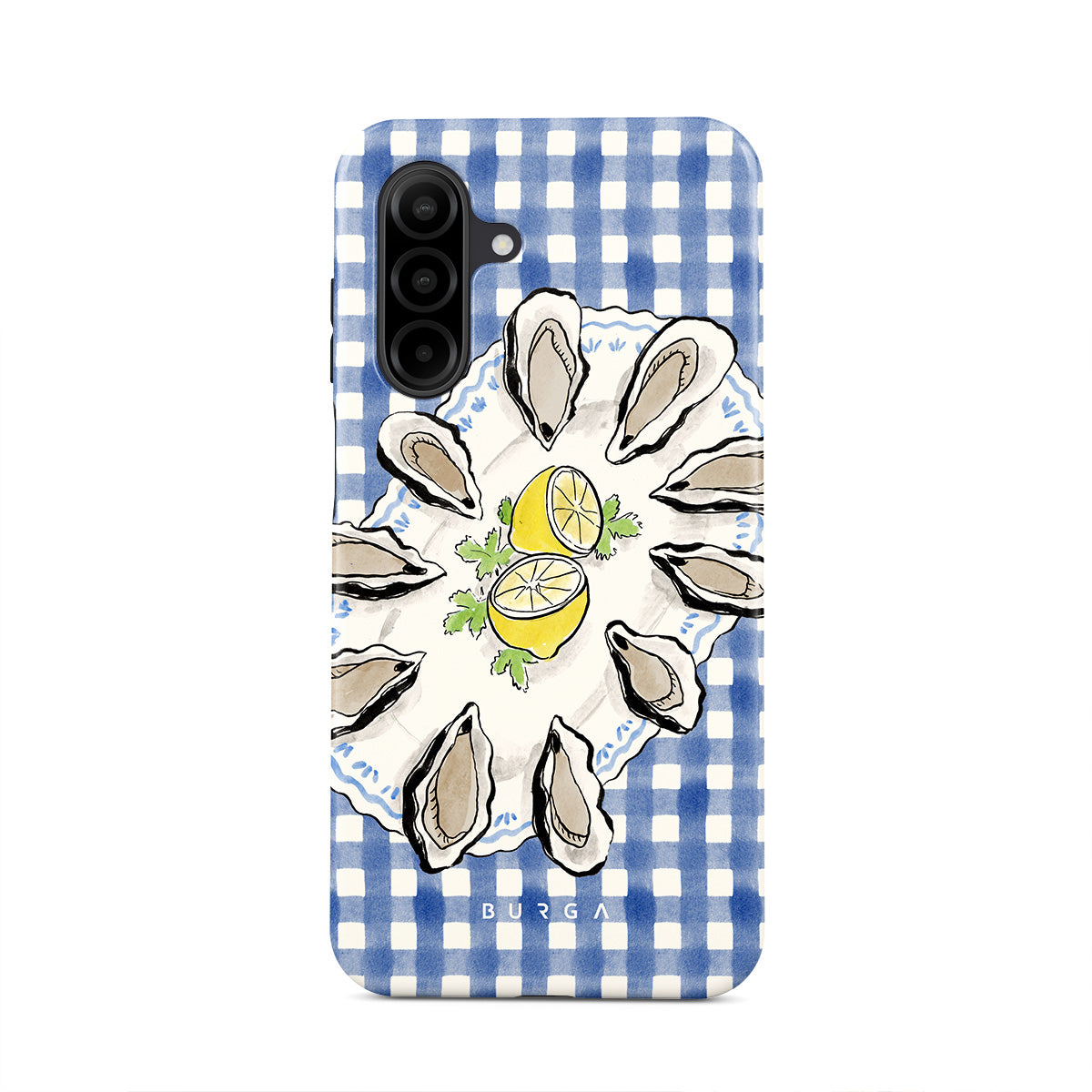 Este design contém:Ostras, limão, padrão xadrez azul, elementos costeiros frescos, tons suaves pastel.