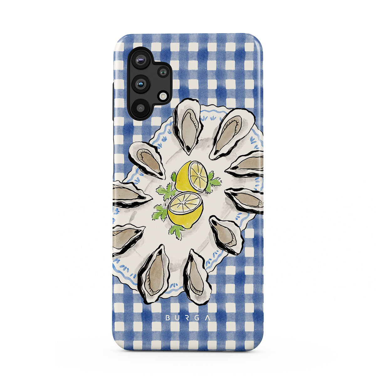 Este design contém:Ostras, limão, padrão xadrez azul, elementos costeiros frescos, tons suaves pastel.