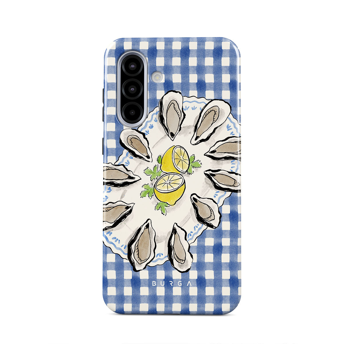Este design contém:Ostras, limão, padrão xadrez azul, elementos costeiros frescos, tons suaves pastel.