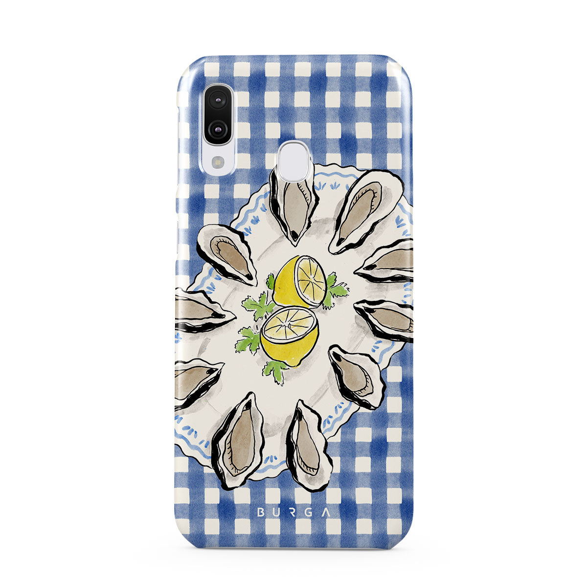 Este design contém:Ostras, limão, padrão xadrez azul, elementos costeiros frescos, tons suaves pastel.