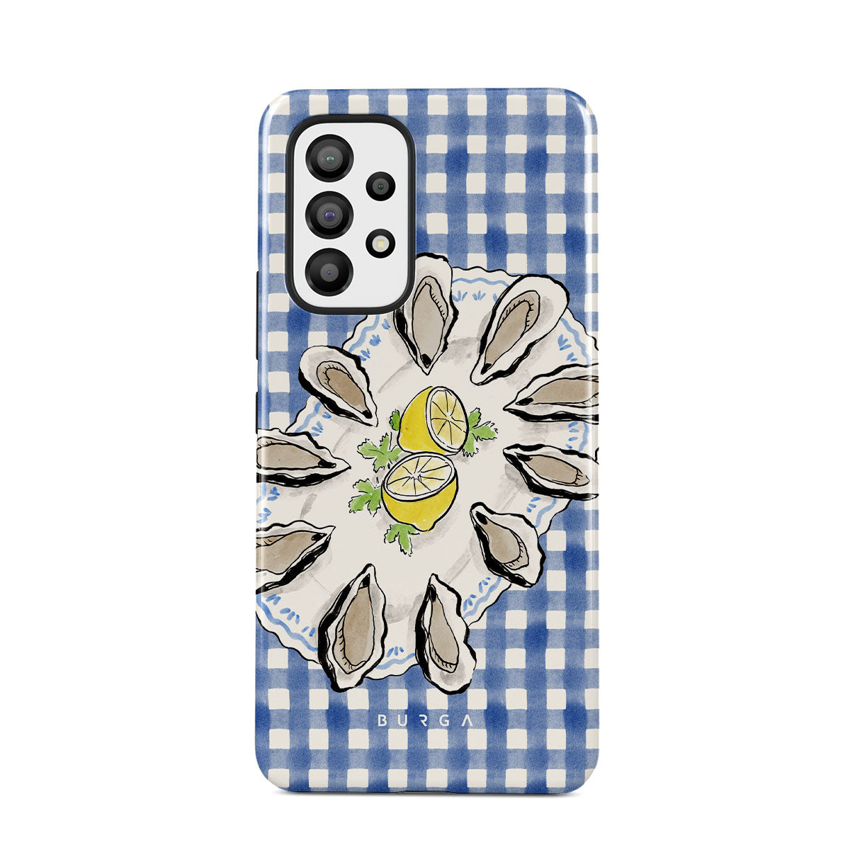 Este design contém:Ostras, limão, padrão xadrez azul, elementos costeiros frescos, tons suaves pastel.