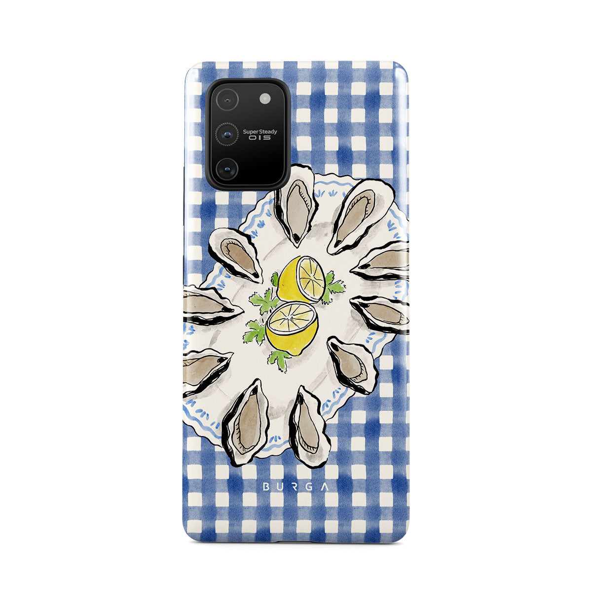 Este design contém:Ostras, limão, padrão xadrez azul, elementos costeiros frescos, tons suaves pastel.