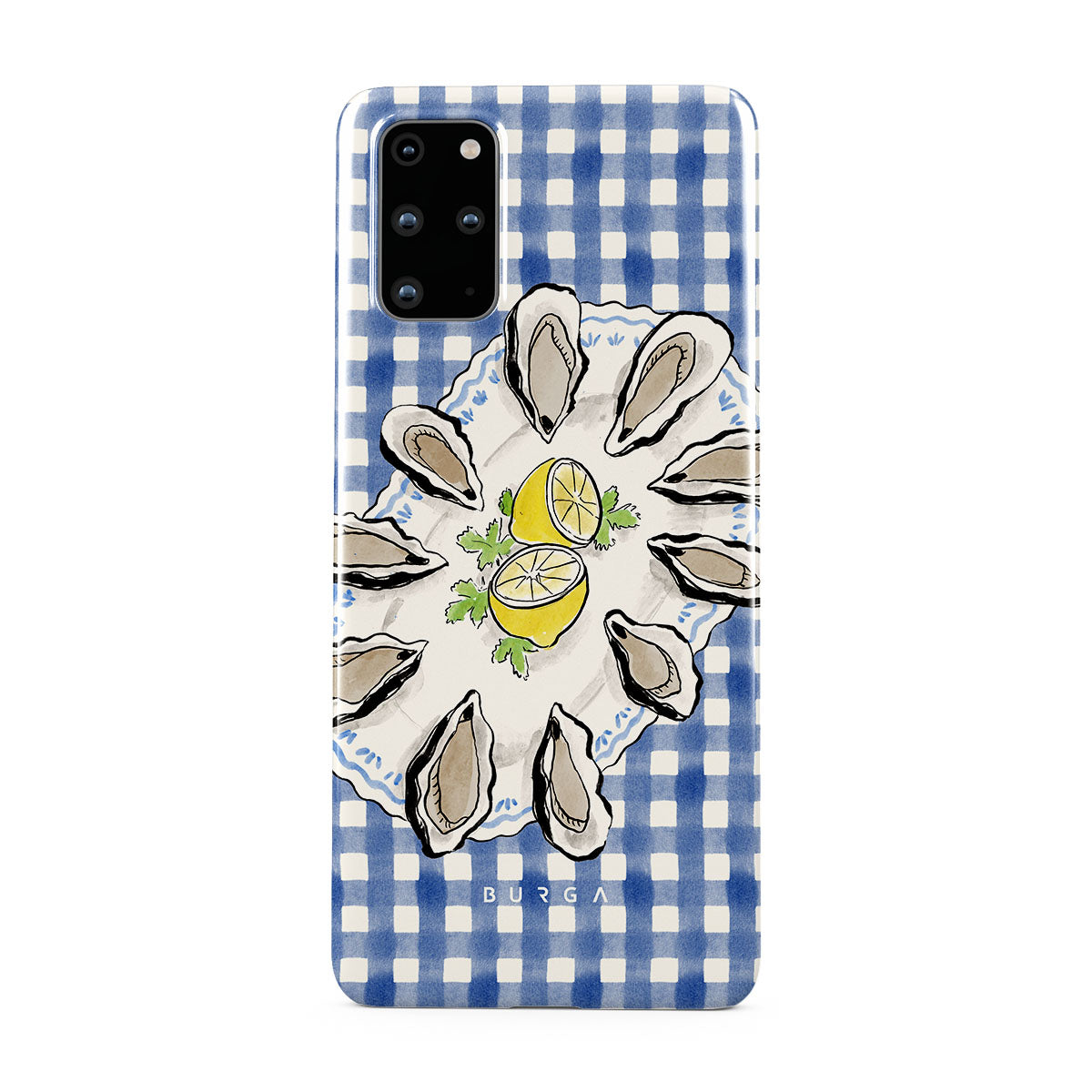 Este design contém:Ostras, limão, padrão xadrez azul, elementos costeiros frescos, tons suaves pastel.