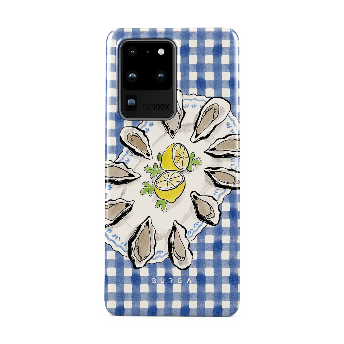Este design contém:Ostras, limão, padrão xadrez azul, elementos costeiros frescos, tons suaves pastel.