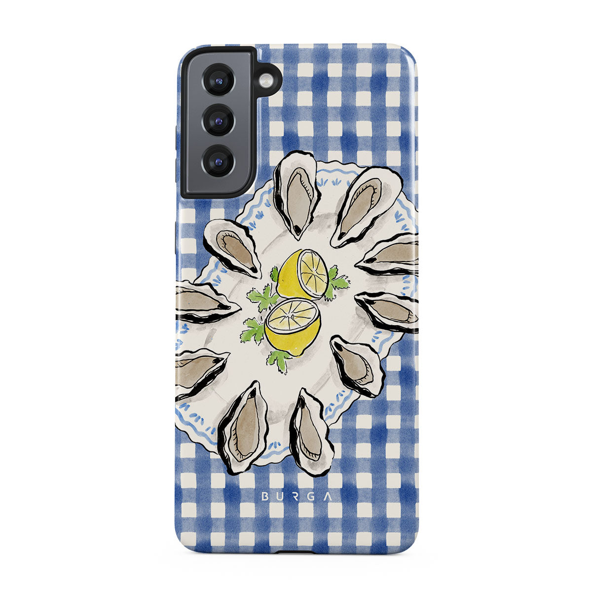 Este design contém:Ostras, limão, padrão xadrez azul, elementos costeiros frescos, tons suaves pastel.