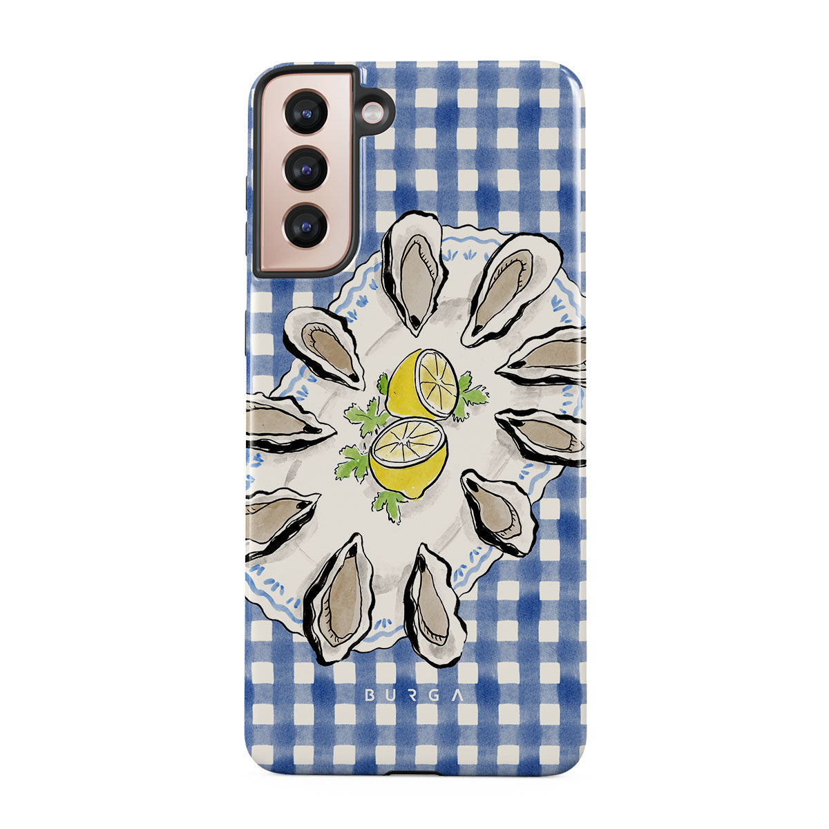 Este design contém:Ostras, limão, padrão xadrez azul, elementos costeiros frescos, tons suaves pastel.