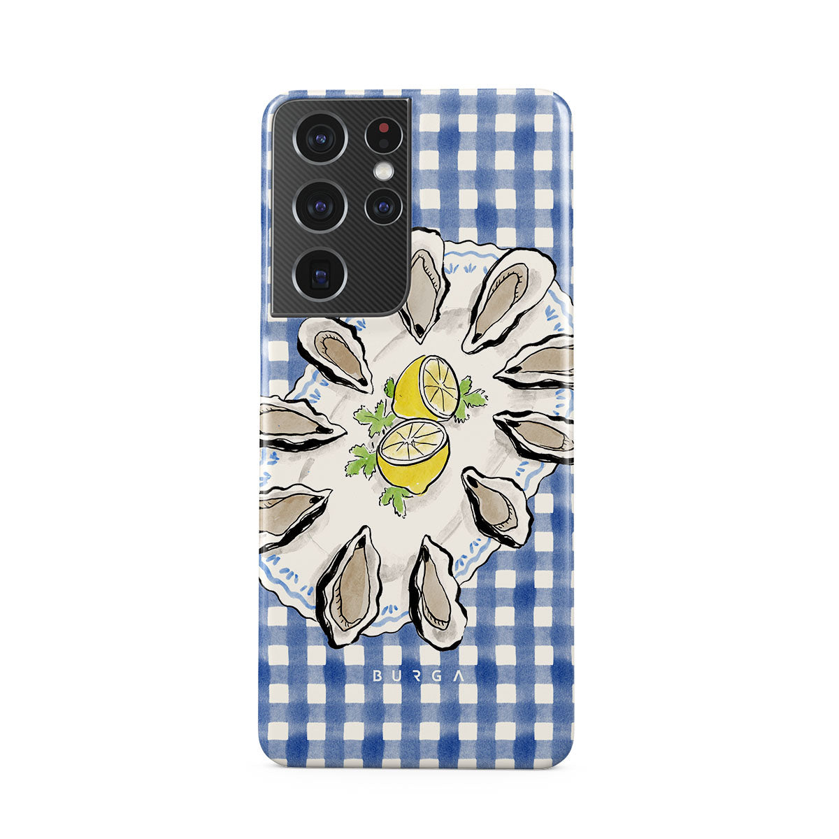 Este design contém:Ostras, limão, padrão xadrez azul, elementos costeiros frescos, tons suaves pastel.