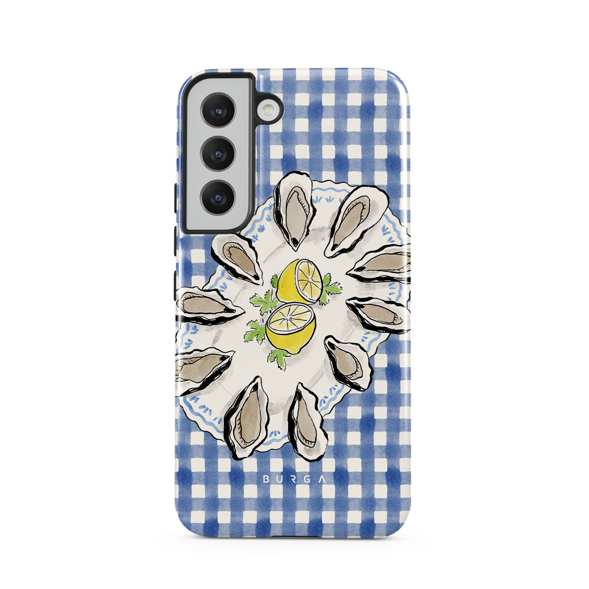 Este design contém:Ostras, limão, padrão xadrez azul, elementos costeiros frescos, tons suaves pastel.