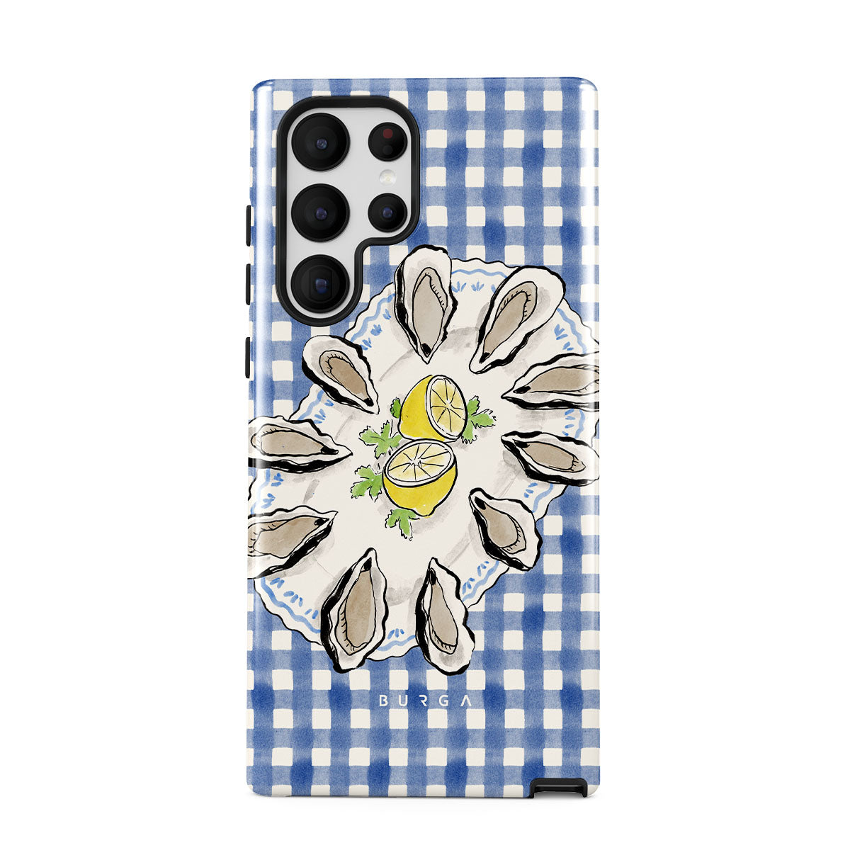 Este design contém:Ostras, limão, padrão xadrez azul, elementos costeiros frescos, tons suaves pastel.