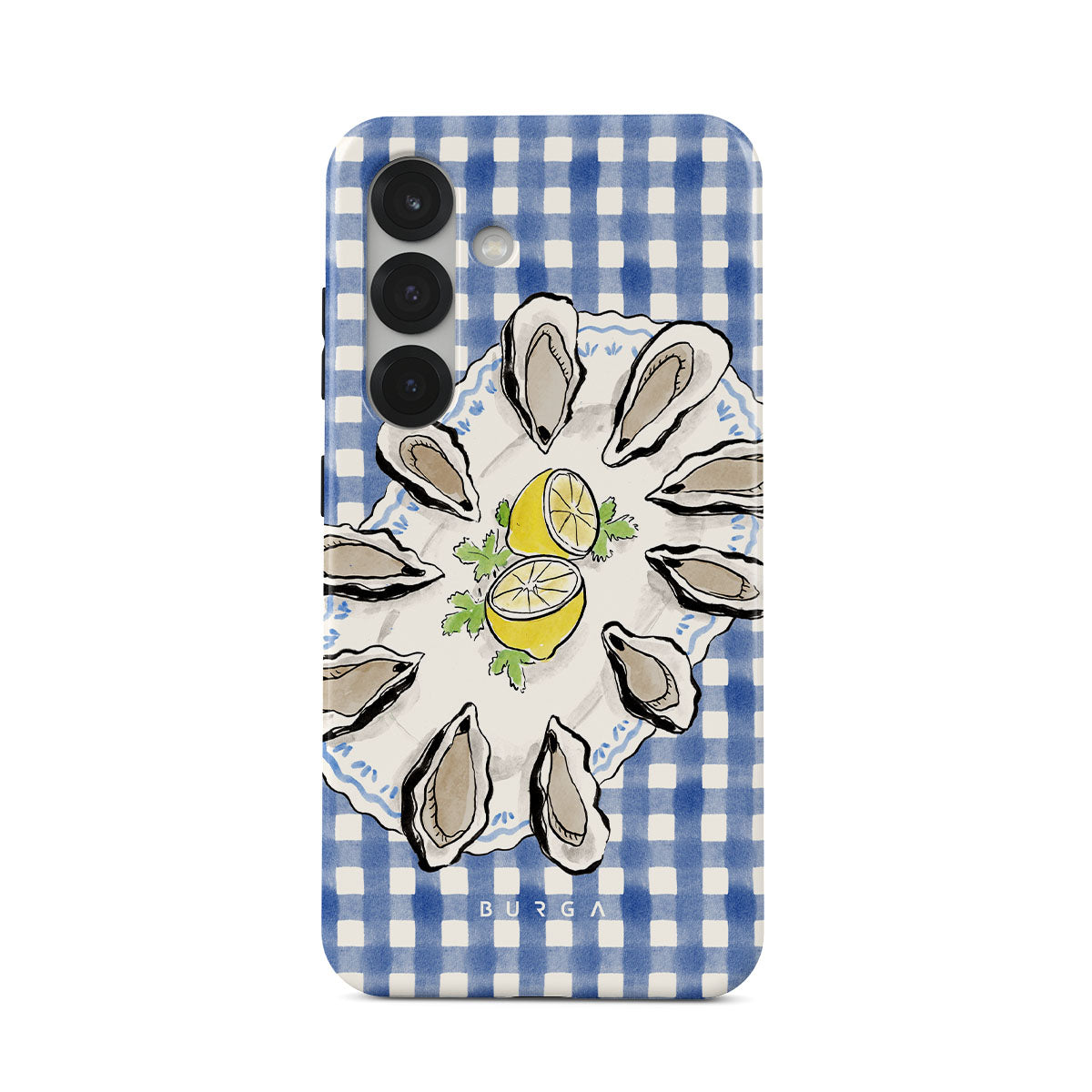 Este design contém:Ostras, limão, padrão xadrez azul, elementos costeiros frescos, tons suaves pastel.