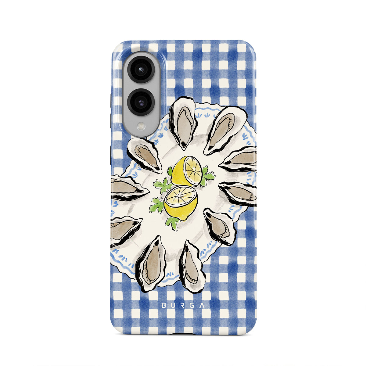 Este design contém:Ostras, limão, padrão xadrez azul, elementos costeiros frescos, tons suaves pastel.