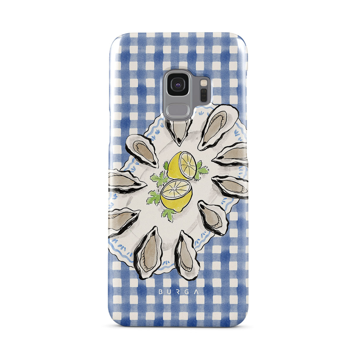 Este design contém:Ostras, limão, padrão xadrez azul, elementos costeiros frescos, tons suaves pastel.
