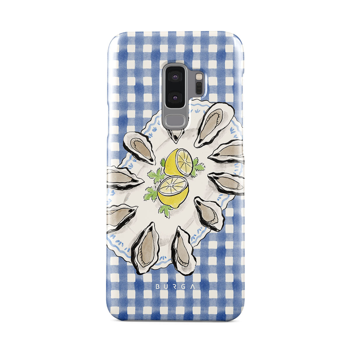 Este design contém:Ostras, limão, padrão xadrez azul, elementos costeiros frescos, tons suaves pastel.