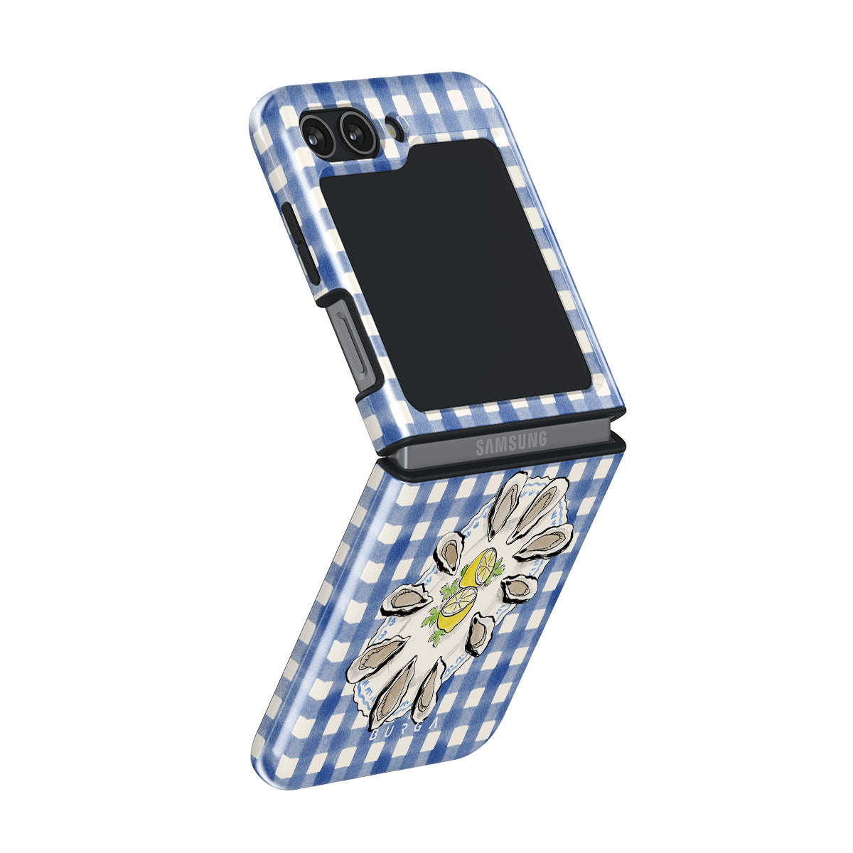 Este design contém:Ostras, limão, padrão xadrez azul, elementos costeiros frescos, tons suaves pastel.