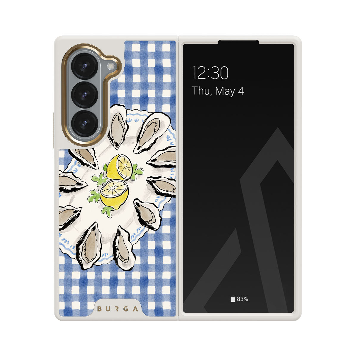 Este design contém:Ostras, limão, padrão xadrez azul, elementos costeiros frescos, tons suaves pastel.