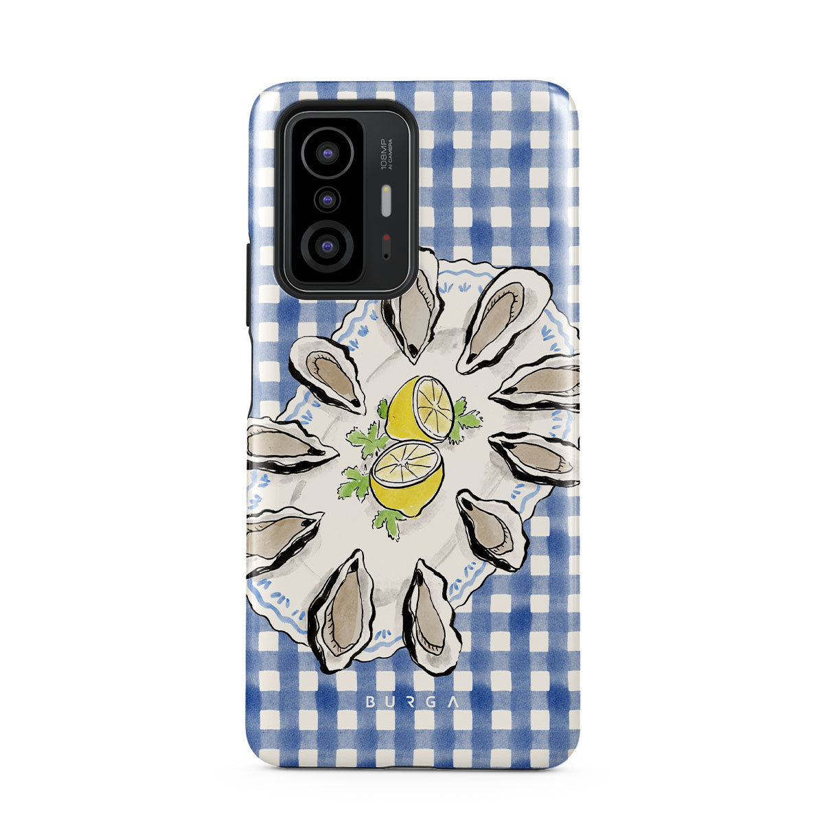 Este design contém:Ostras, limão, padrão xadrez azul, elementos costeiros frescos, tons suaves pastel.