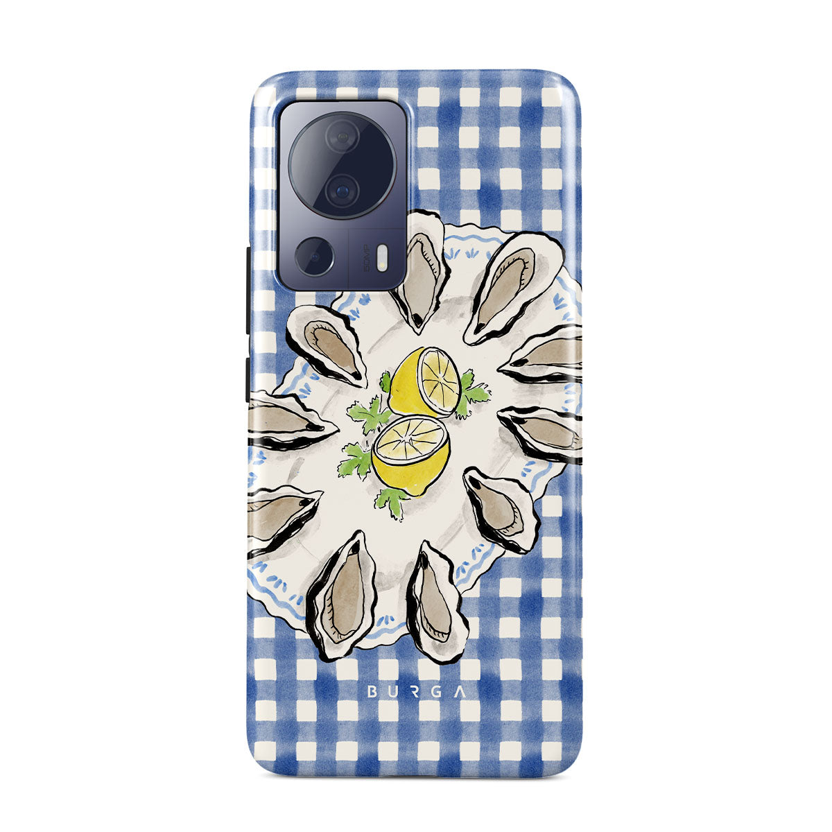 Este design contém:Ostras, limão, padrão xadrez azul, elementos costeiros frescos, tons suaves pastel.