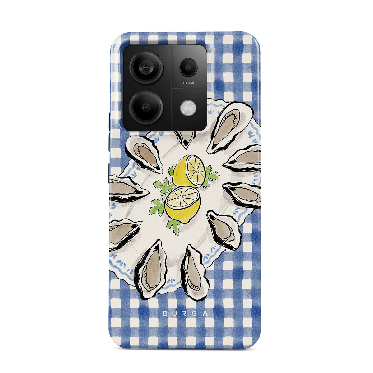 Este design contém:Ostras, limão, padrão xadrez azul, elementos costeiros frescos, tons suaves pastel.