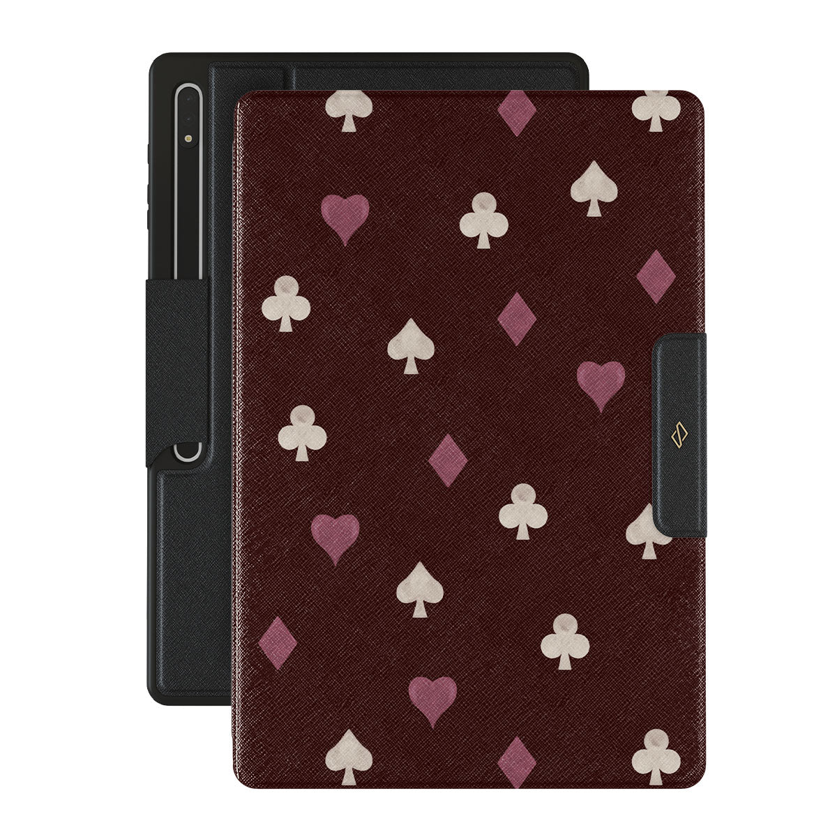Este design contém: naipes de cartas, corações, espadas, ouros, paus, fundo bordô