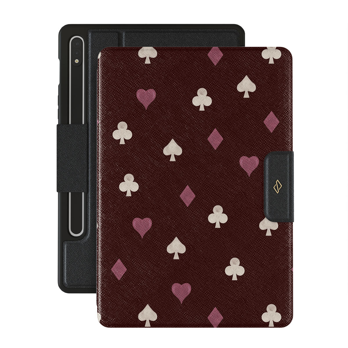 Este design contém: naipes de cartas, corações, espadas, ouros, paus, fundo bordô