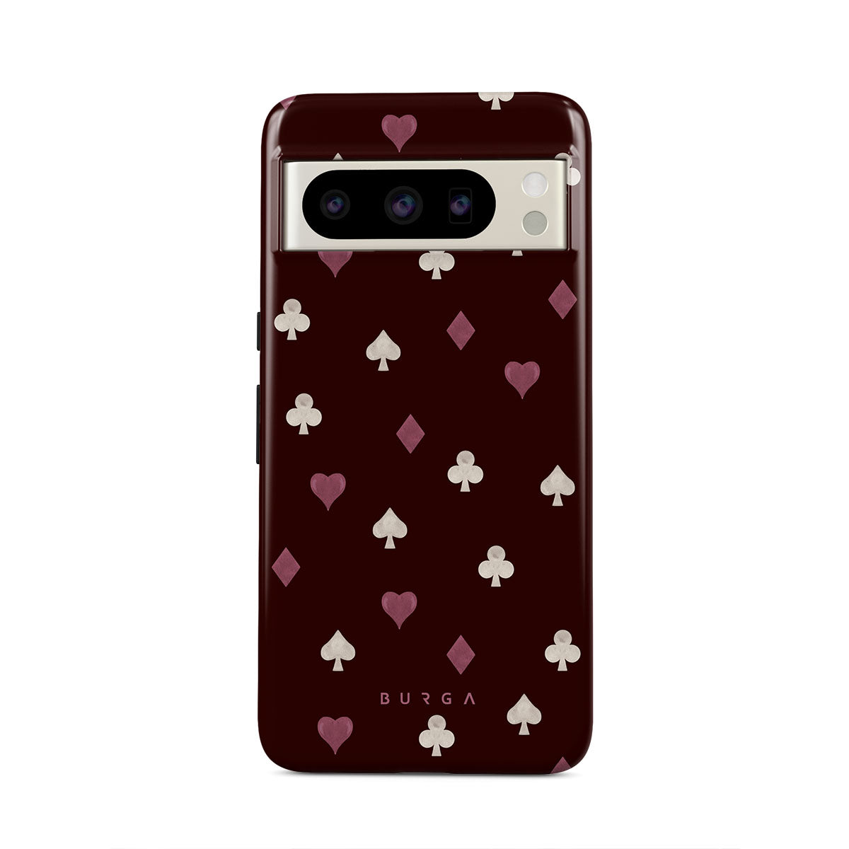 Este design contém: naipes de cartas, corações, espadas, ouros, paus, fundo bordô