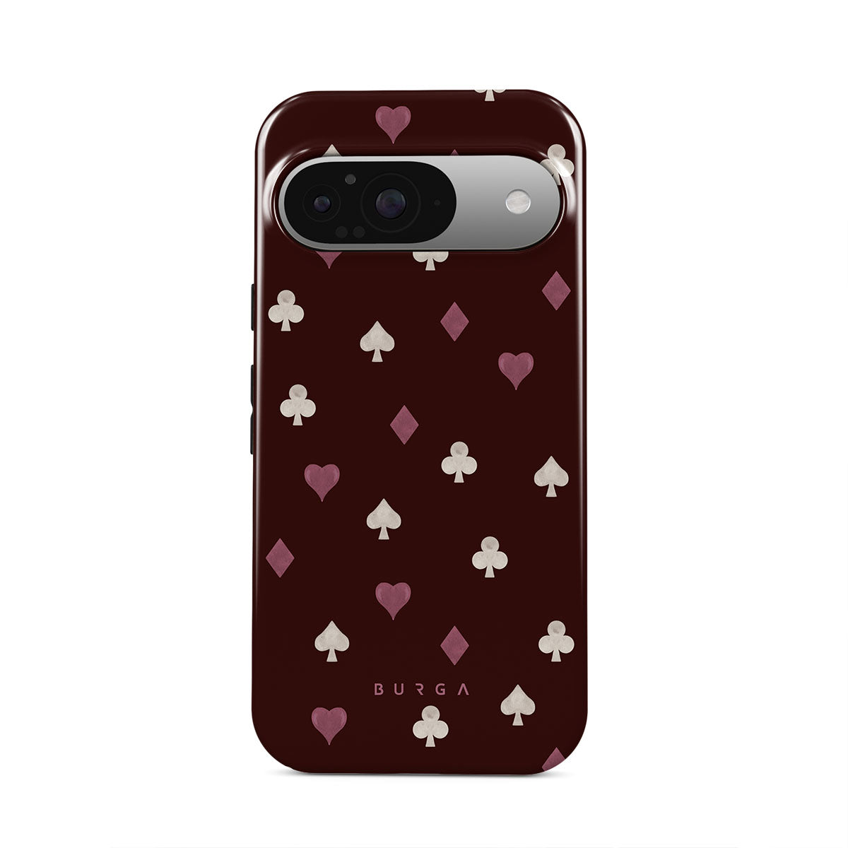 Este design contém: naipes de cartas, corações, espadas, ouros, paus, fundo bordô