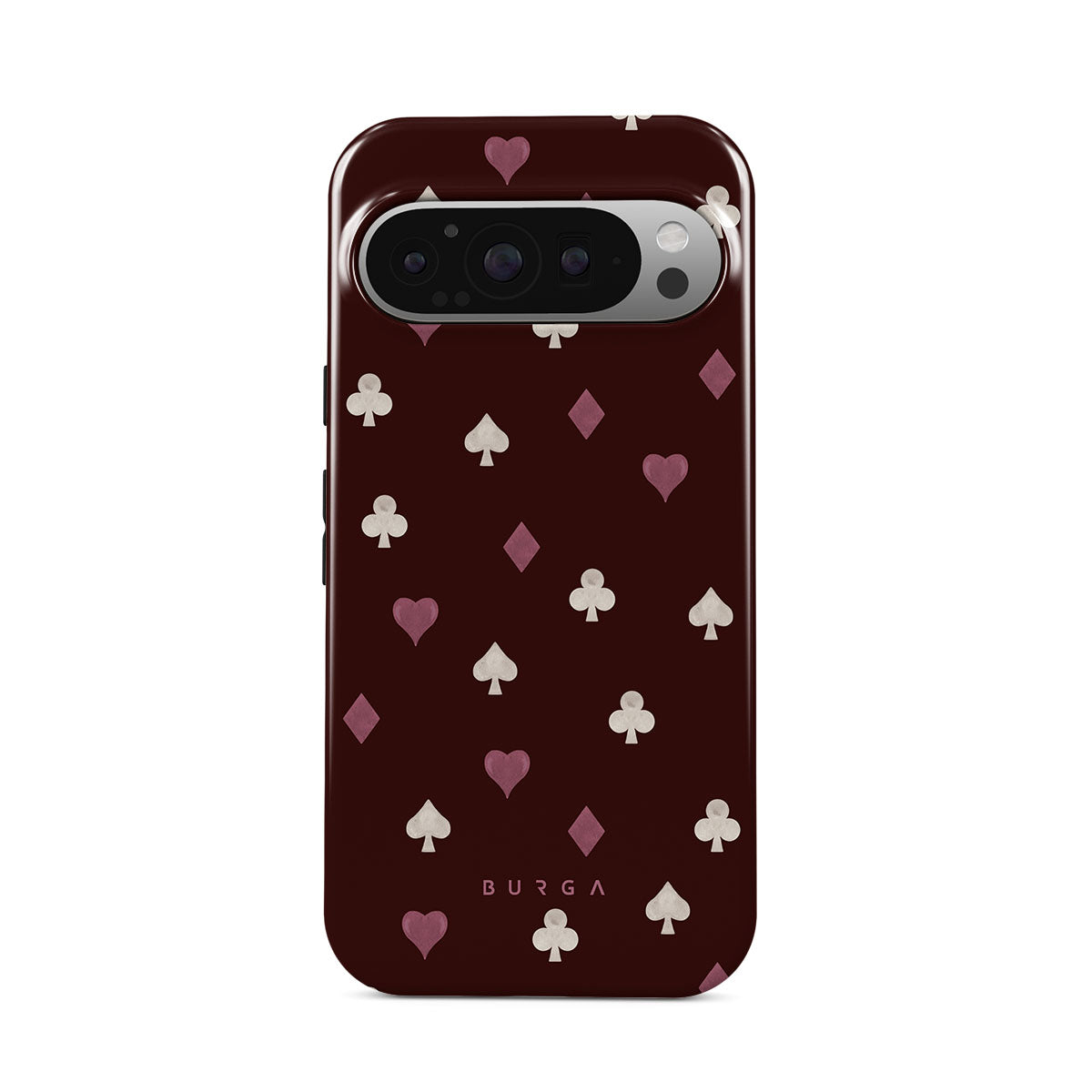 Este design contém: naipes de cartas, corações, espadas, ouros, paus, fundo bordô