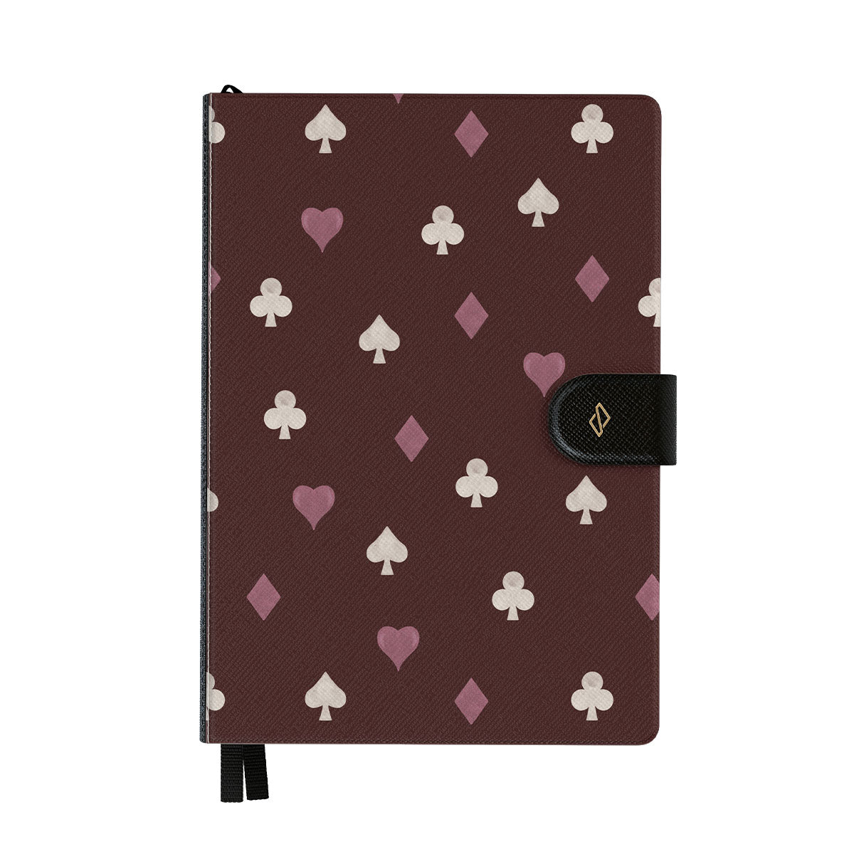 Este design contém: naipes de cartas, corações, espadas, ouros, paus, fundo bordô
