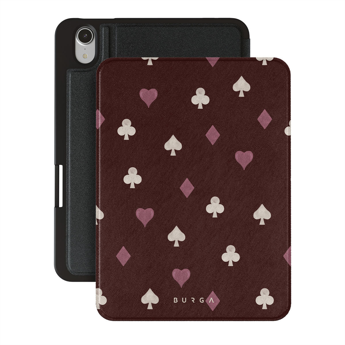 Este design contém: naipes de cartas, corações, espadas, ouros, paus, fundo bordô