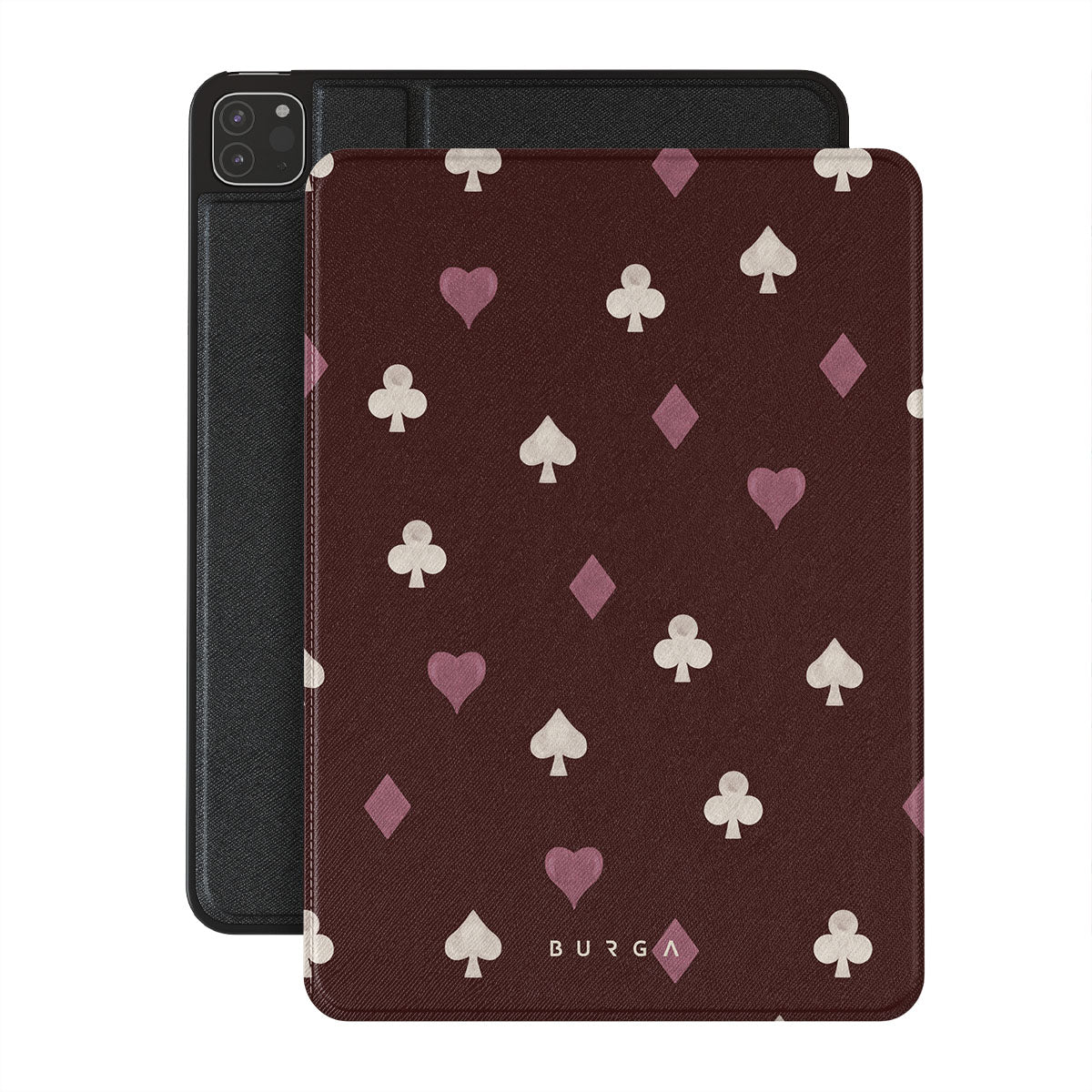 Este design contém: naipes de cartas, corações, espadas, ouros, paus, fundo bordô