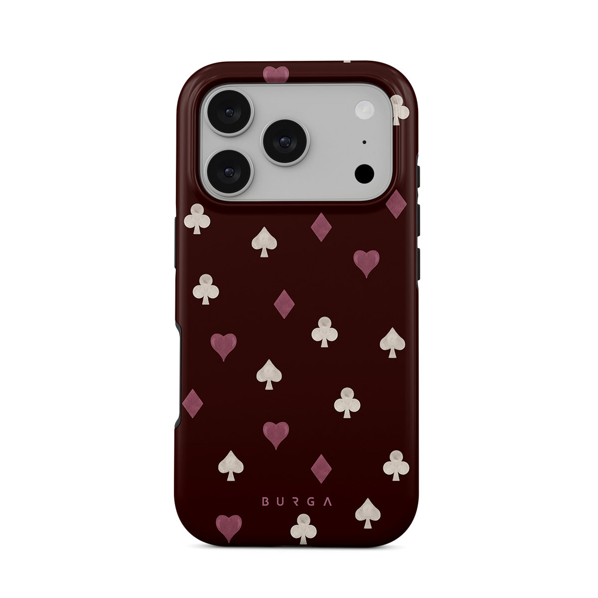 Este design contém: naipes de cartas, corações, espadas, ouros, paus, fundo bordô