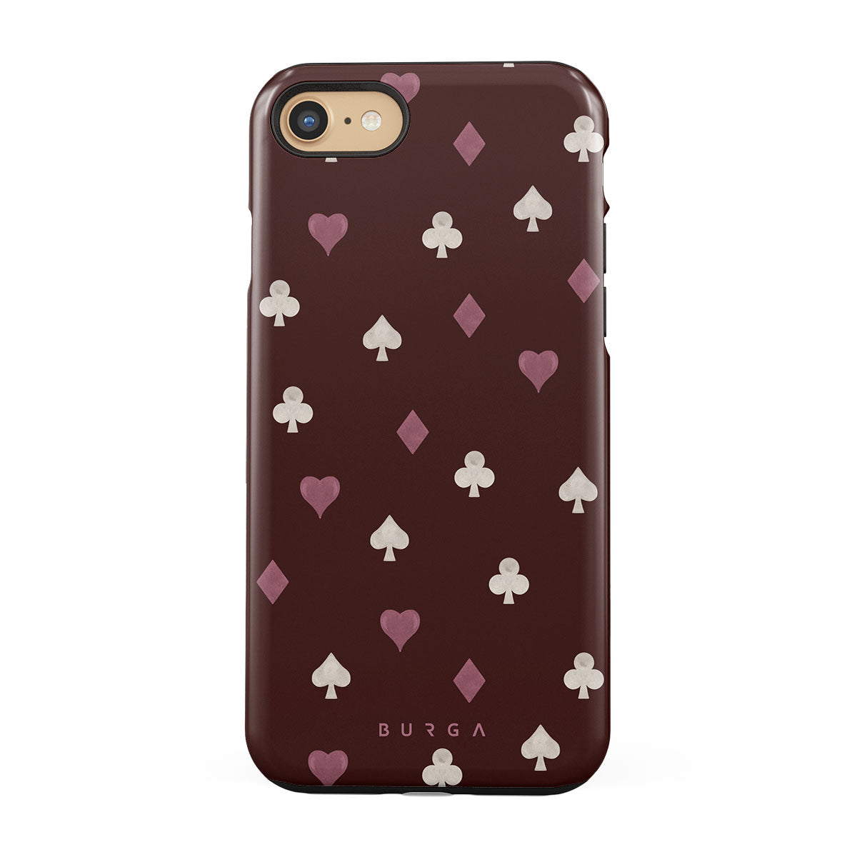 Este design contém: naipes de cartas, corações, espadas, ouros, paus, fundo bordô