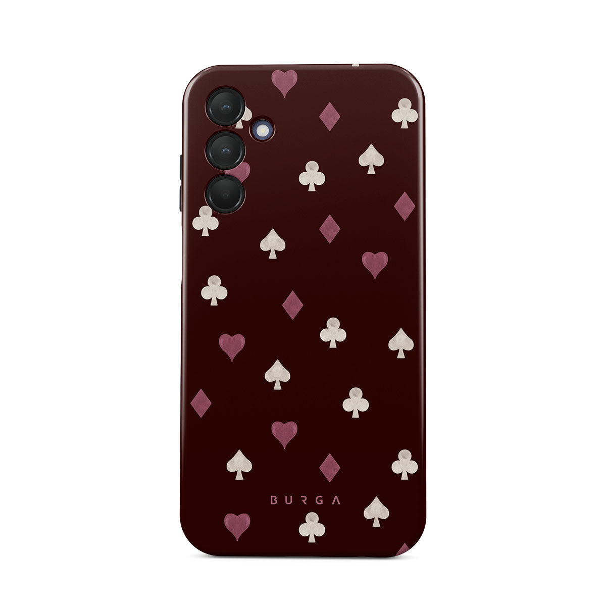 Este design contém: naipes de cartas, corações, espadas, ouros, paus, fundo bordô