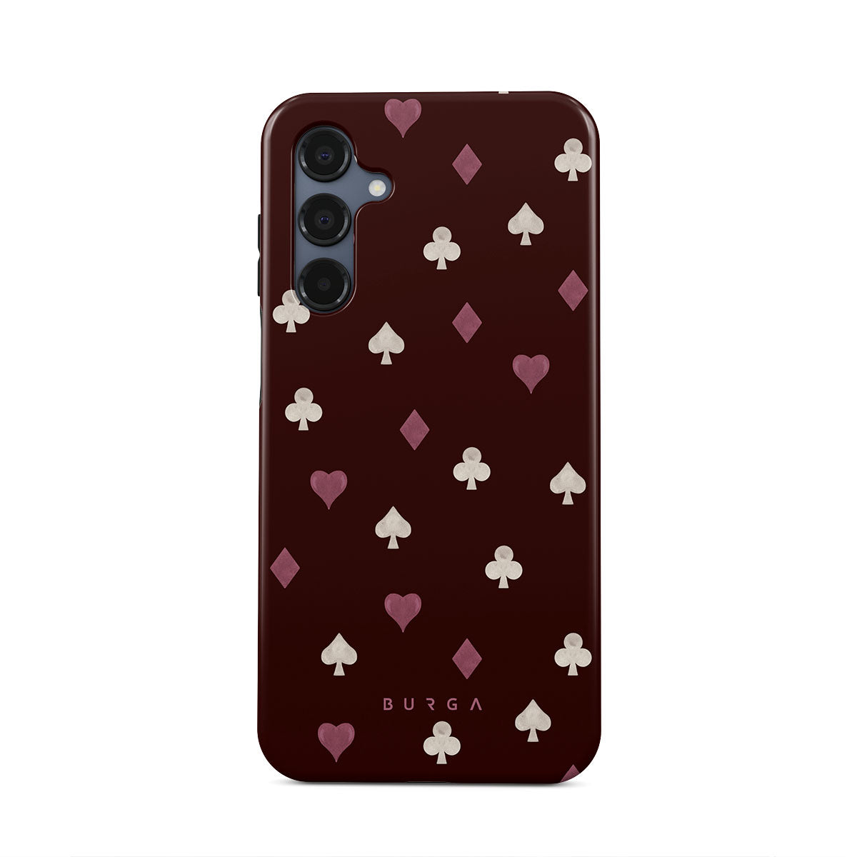 Este design contém: naipes de cartas, corações, espadas, ouros, paus, fundo bordô