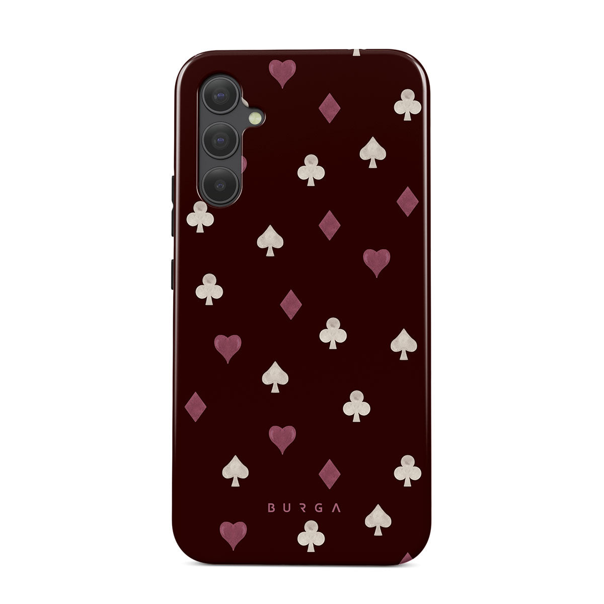 Este design contém: naipes de cartas, corações, espadas, ouros, paus, fundo bordô