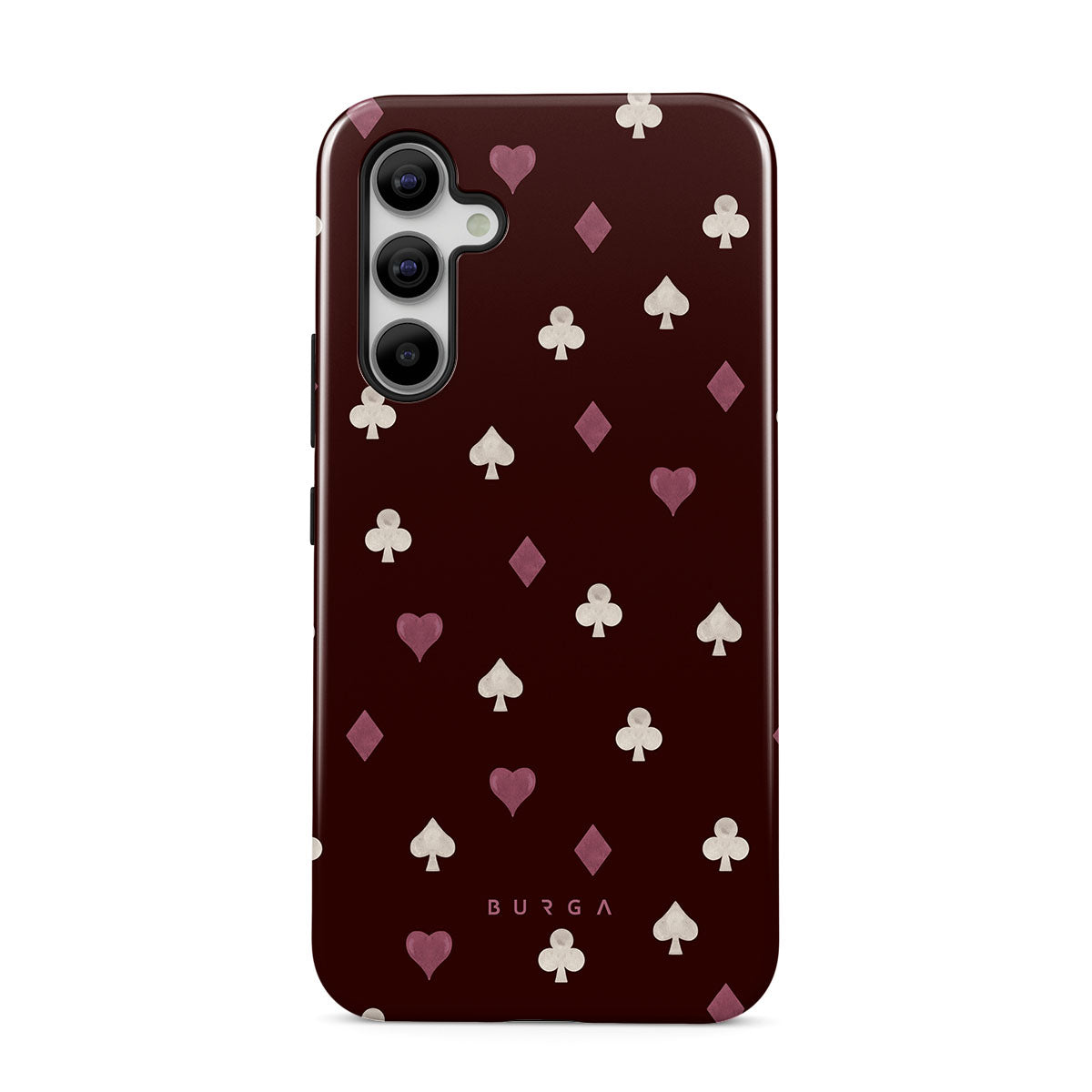 Este design contém: naipes de cartas, corações, espadas, ouros, paus, fundo bordô