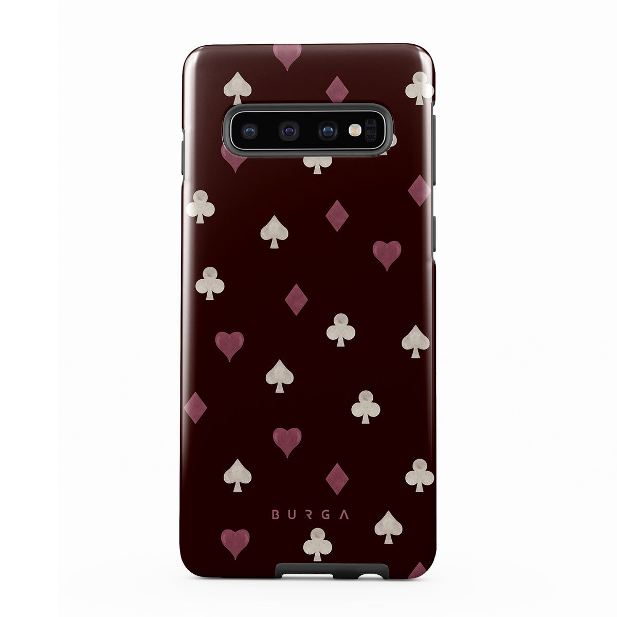 Este design contém: naipes de cartas, corações, espadas, ouros, paus, fundo bordô