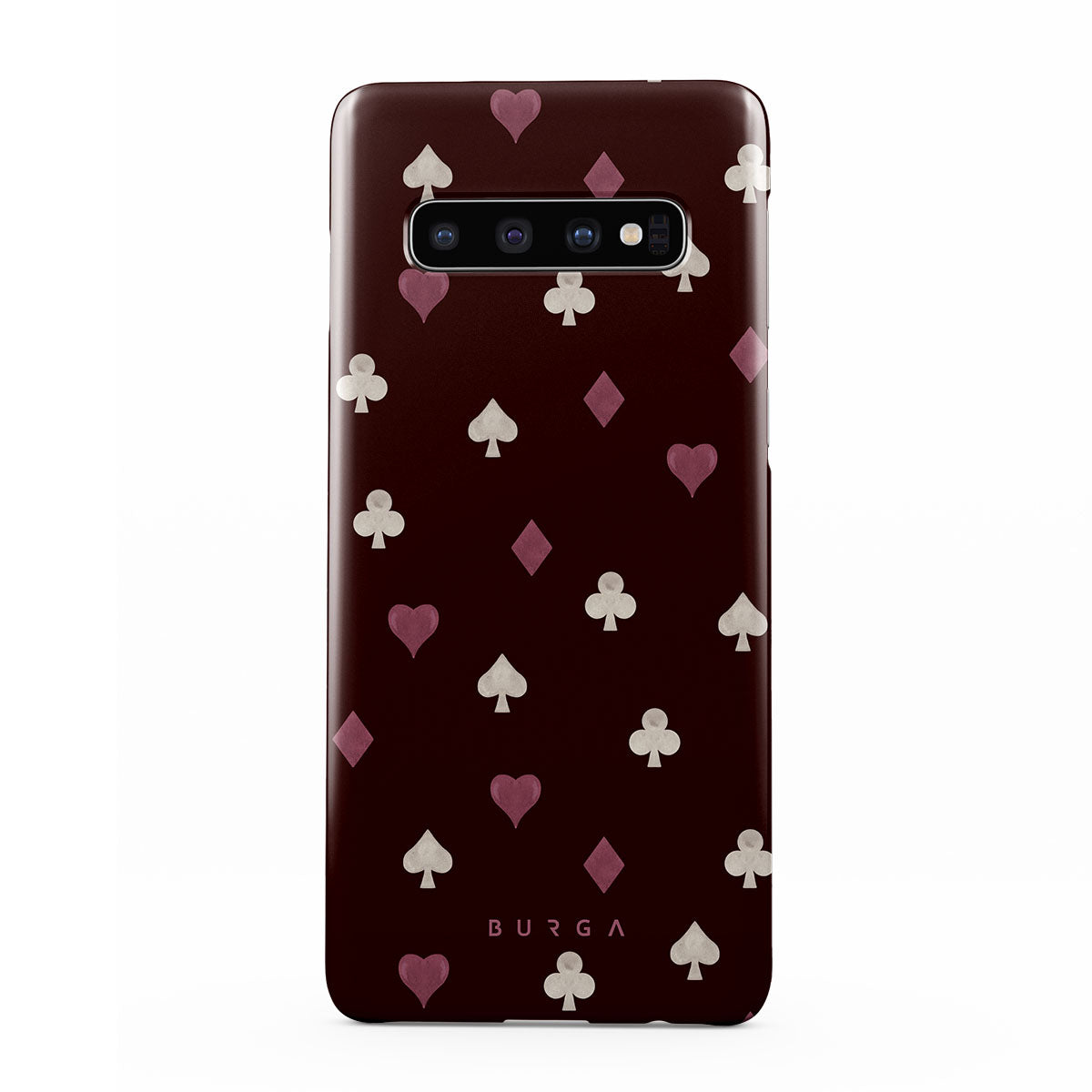Este design contém: naipes de cartas, corações, espadas, ouros, paus, fundo bordô