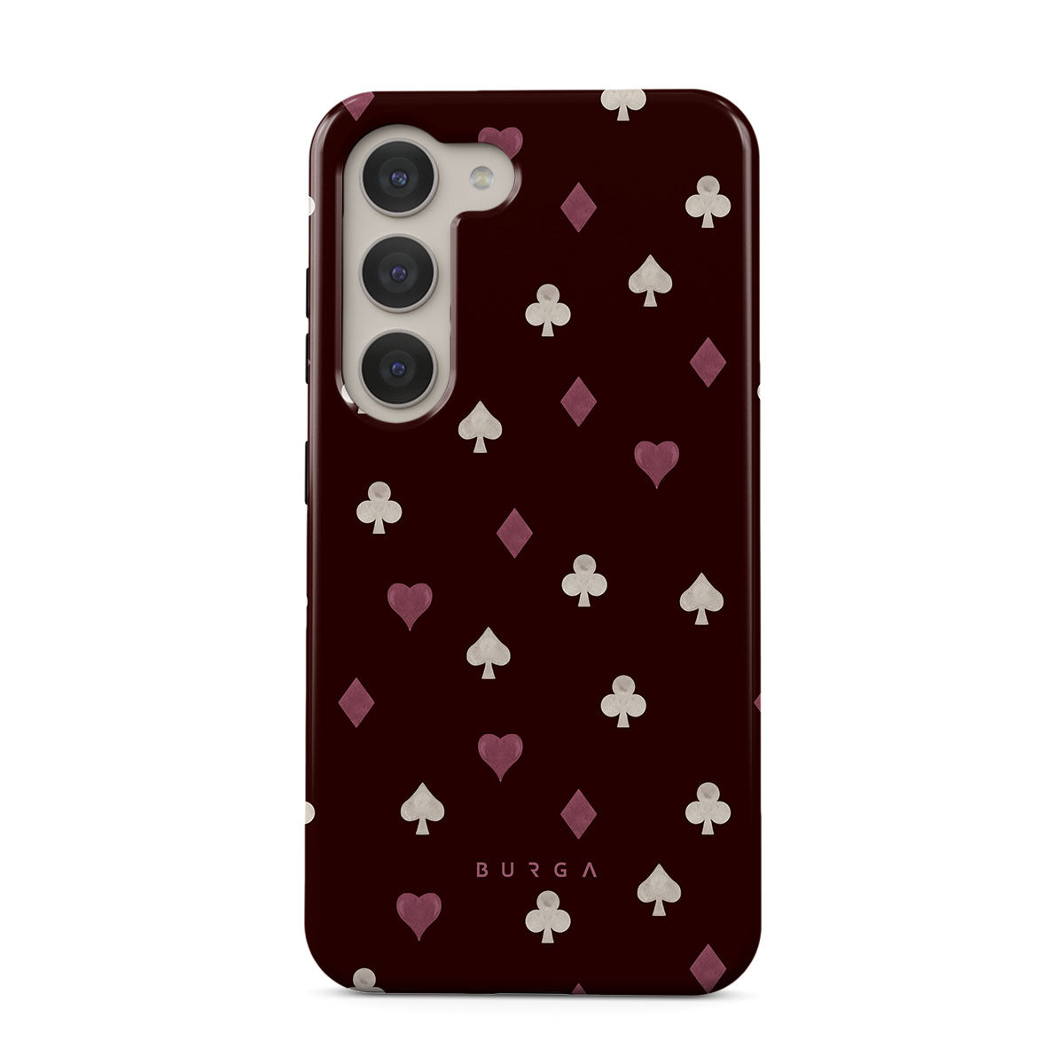 Este design contém: naipes de cartas, corações, espadas, ouros, paus, fundo bordô