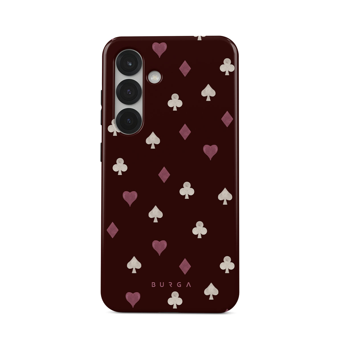 Este design contém: naipes de cartas, corações, espadas, ouros, paus, fundo bordô