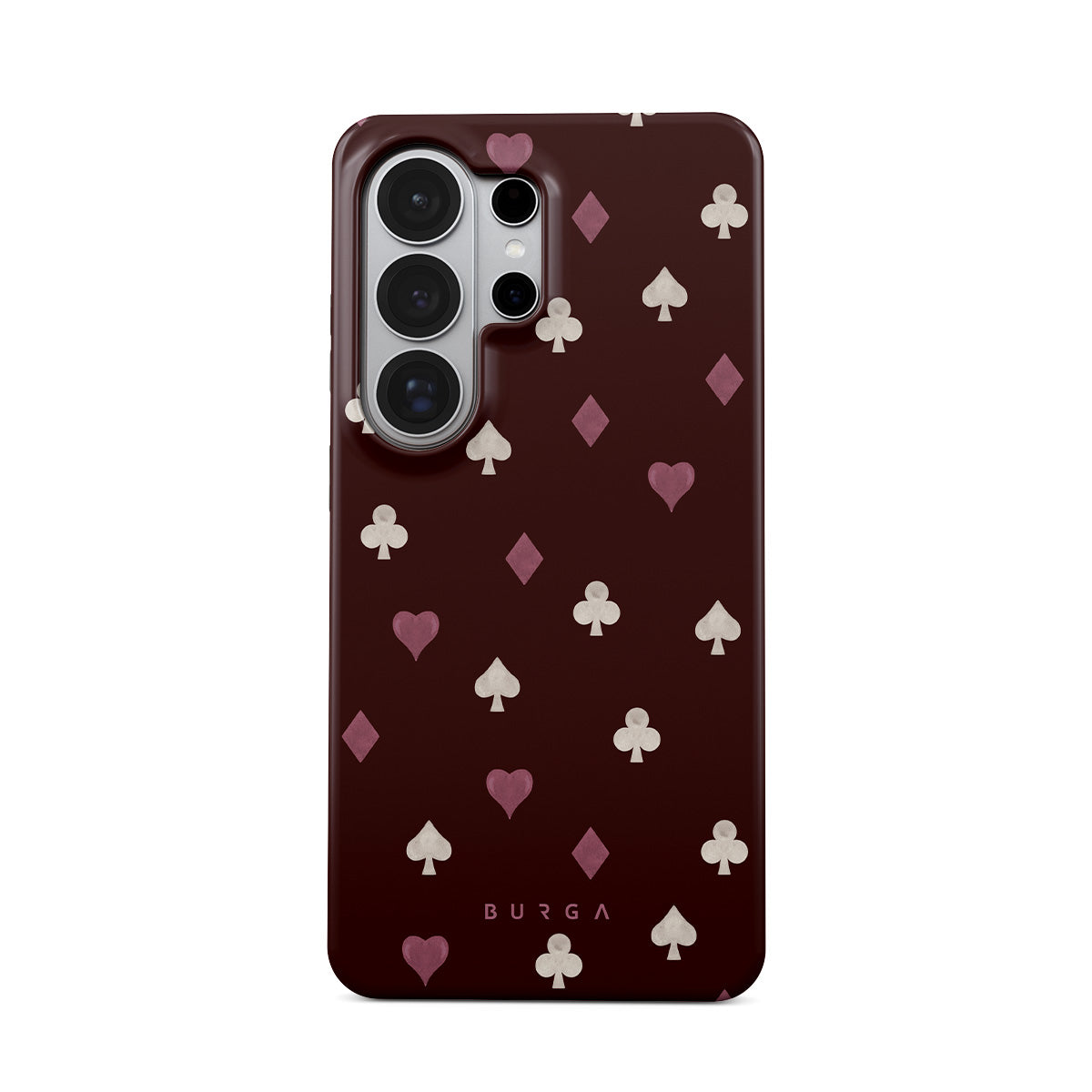 Este design contém: naipes de cartas, corações, espadas, ouros, paus, fundo bordô