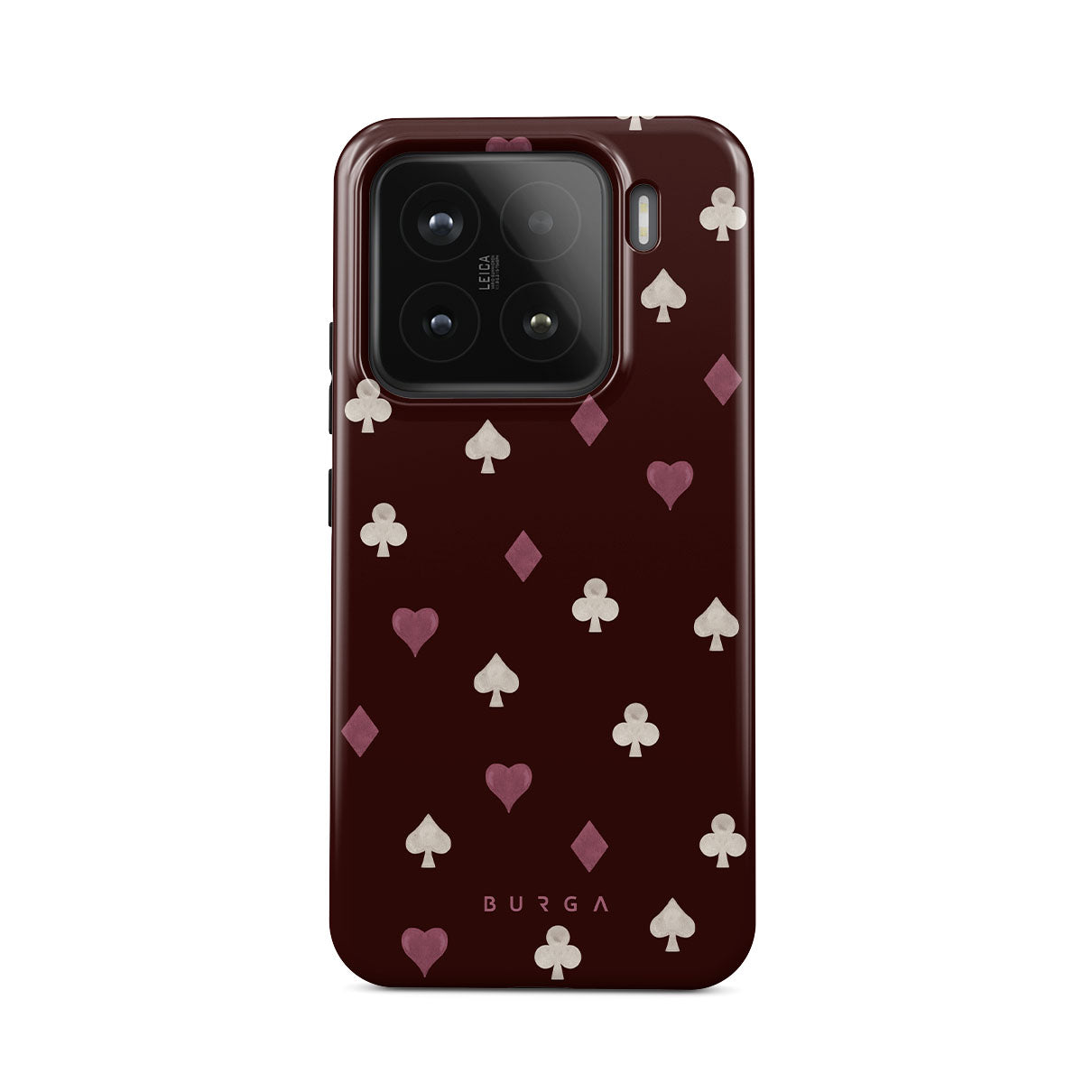 Este design contém: naipes de cartas, corações, espadas, ouros, paus, fundo bordô