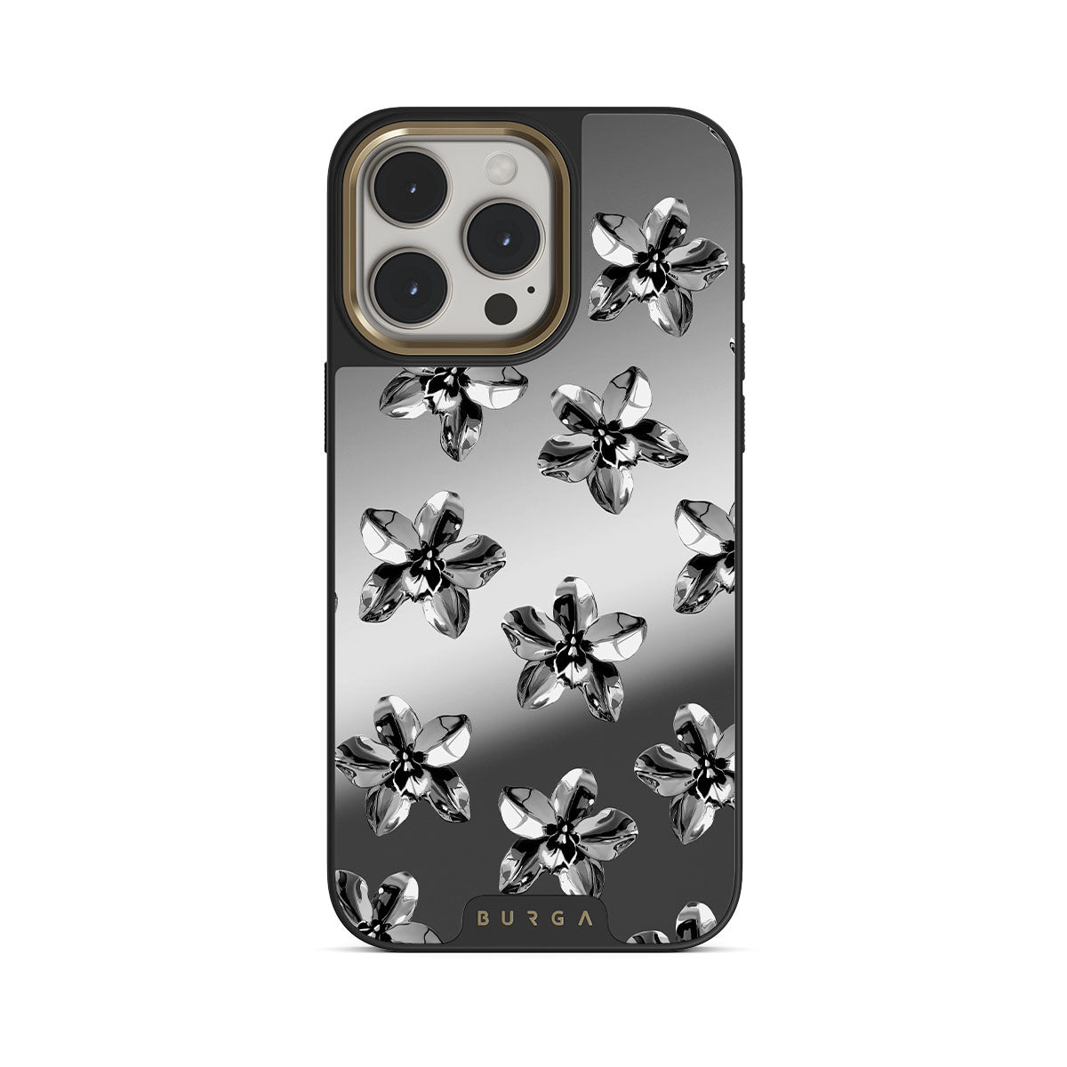 Este design contém: flores prateadas, detalhes metálicos, espelho