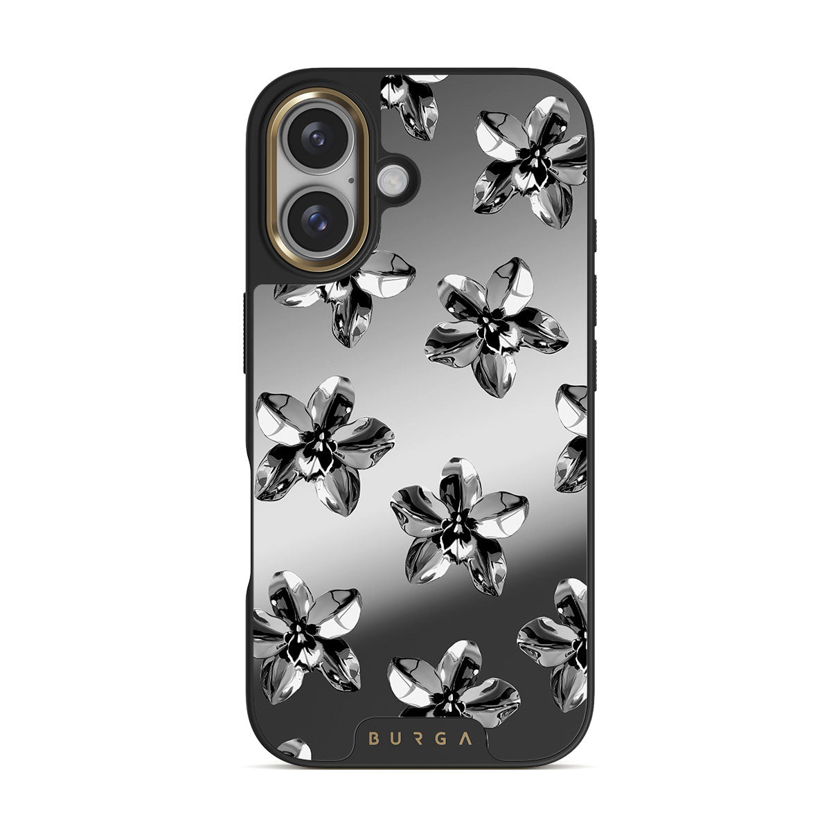 Este design contém: flores prateadas, detalhes metálicos, espelho