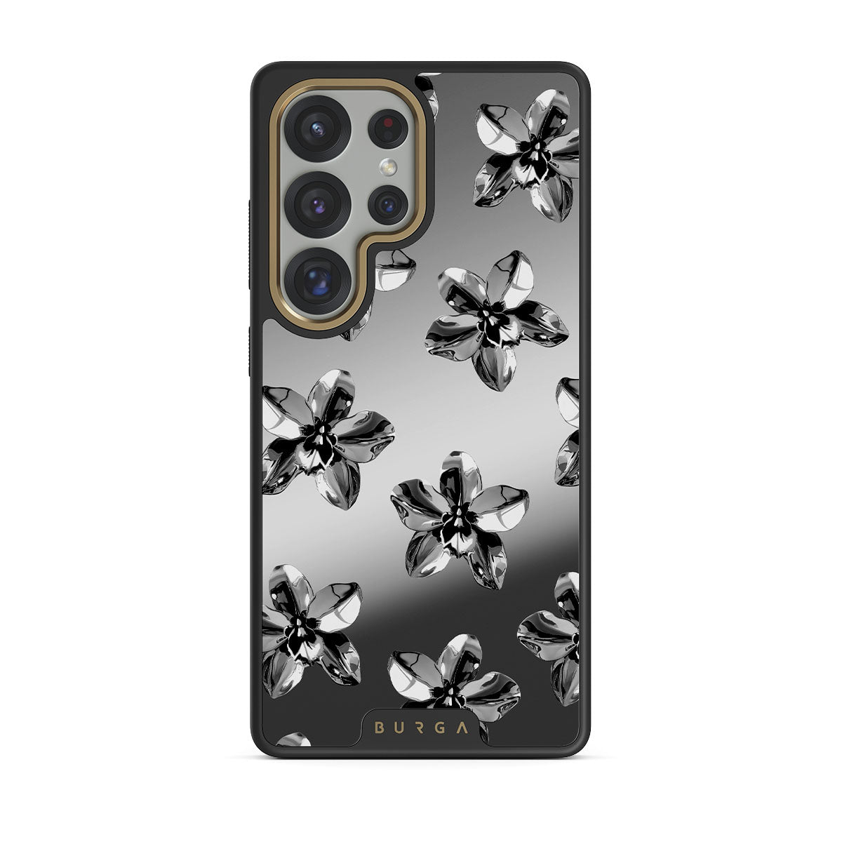 Este design contém: flores prateadas, detalhes metálicos, espelho