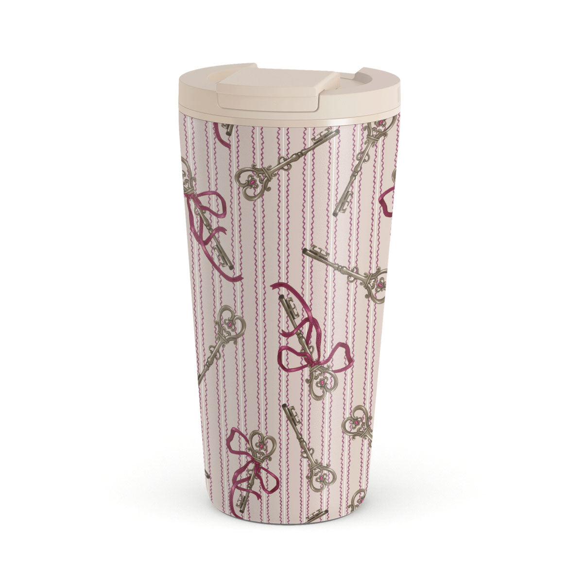 Este design contém: chaves antigas, laços, fitas cor-de-rosa, fundo às riscas