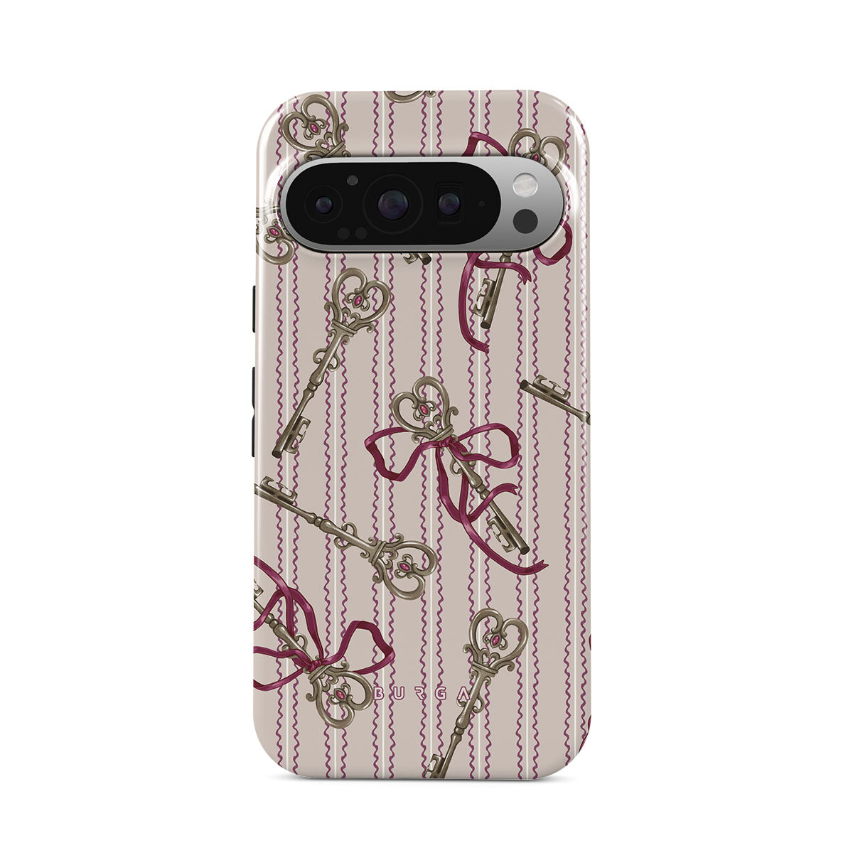 Este design contém: chaves antigas, laços, fitas cor-de-rosa, fundo às riscas