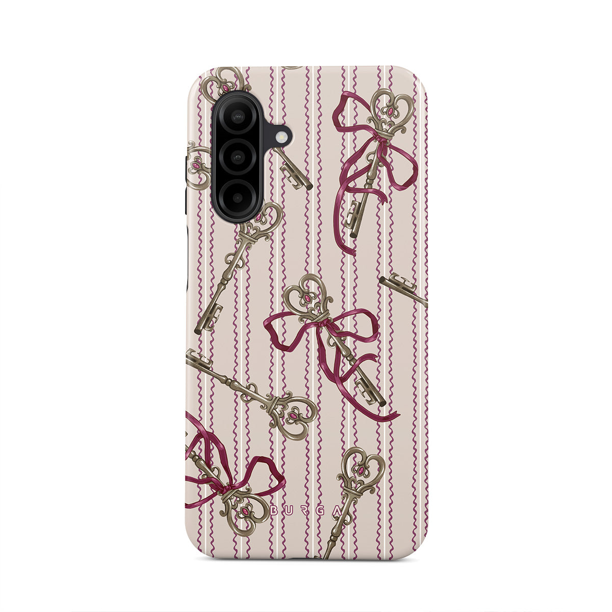 Este design contém: chaves antigas, laços, fitas cor-de-rosa, fundo às riscas