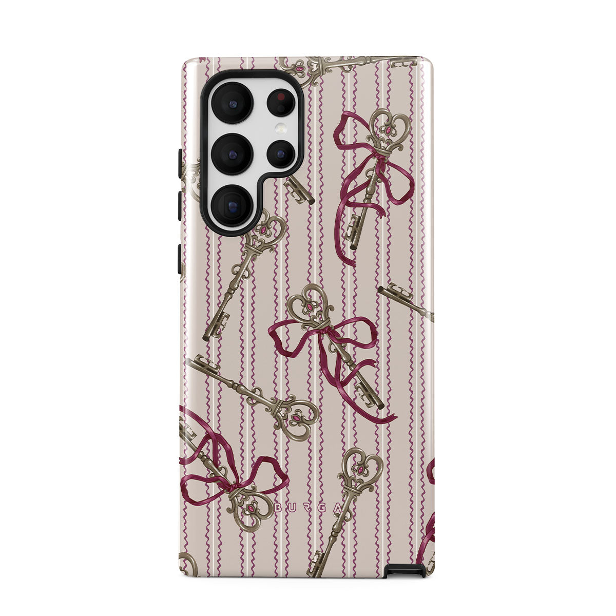 Este design contém: chaves antigas, laços, fitas cor-de-rosa, fundo às riscas